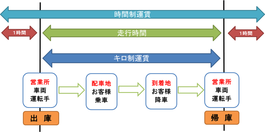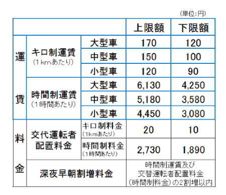 1時間当たりの運賃と1キロ当たりの運賃は上限から下限までが決められており、その範囲内で計算されます。